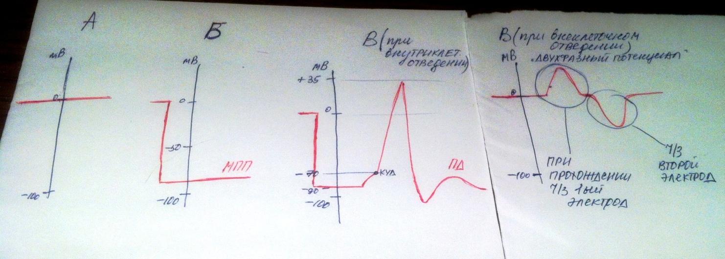 Дифазный ПД(Возбуждение, которое представляет собой волну электроотрицательности, перемещаясь по мембране, доходит сначала до одного электрода, затем помещается между электродами, наконец достигает второго электрода, а затем распространяется дальше. ) будет зарегестрирован в случае В( если электроды расположены как при внеклеточном отведении).