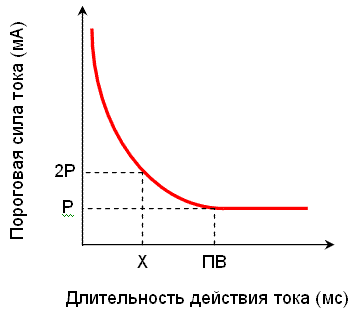 5.Результаты исс. поясните графиком, обозначив на нем величины раздражающего тока, приведенные в условии задачи и хронаксию.(на графике Р=2,5, 2Р=5)