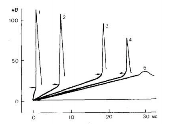 4. Какое условие, необходимое для возникновения возбуждения очевидно не было соблюдено? Длительность раздражения превышала полезное время.