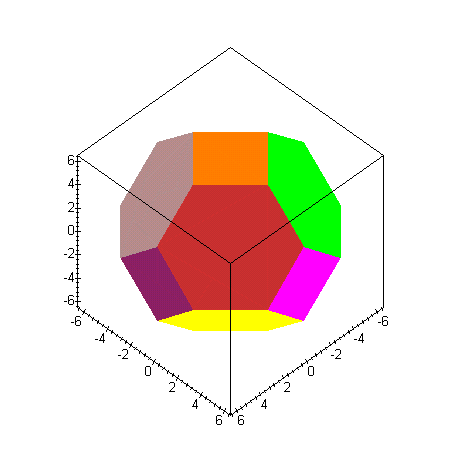 Выполненное построение требует около двух часов работы компьютера с процессором P166 и использует приблизительно 34 мегабайта памяти. Это слишком большая цена, которую приходится платить за удобства написания программы с использованием пакета "Линейная алгебра". Ниже приведен вариант этой же программы, в которой функции пакета используются минимально. Т.е. все векторные операции расписаны покоординатно и выполнены без обращения к функциям пакета. То же самое построение занимает уже не более пяти минут, что вполне приемлимо. Мы не пишем комментарий к этому варианту программы, т.к. она по сути та же самая. Исключение - это последний оператор, с помощью которого осуществляется вращение полиэдра относительно вертикальной оси.