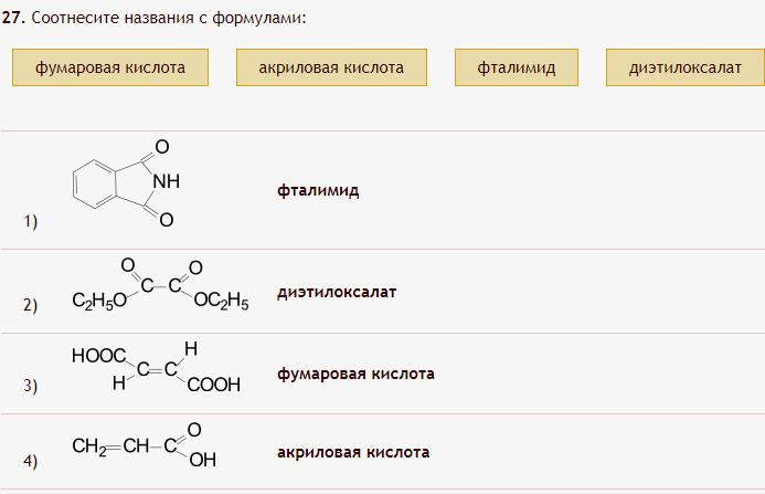 Соотнесите название соединения с его формулой: фумаровая кислота, акриловая кислота, фталимид, диэтилоксалат