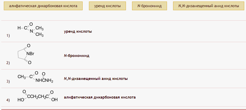 Соотнесите название класса соединений с формулой: алифатическая дикарбоновая кислота, уреид кислоты, N-бромоимид, N,N-дизамещенный амид кислоты