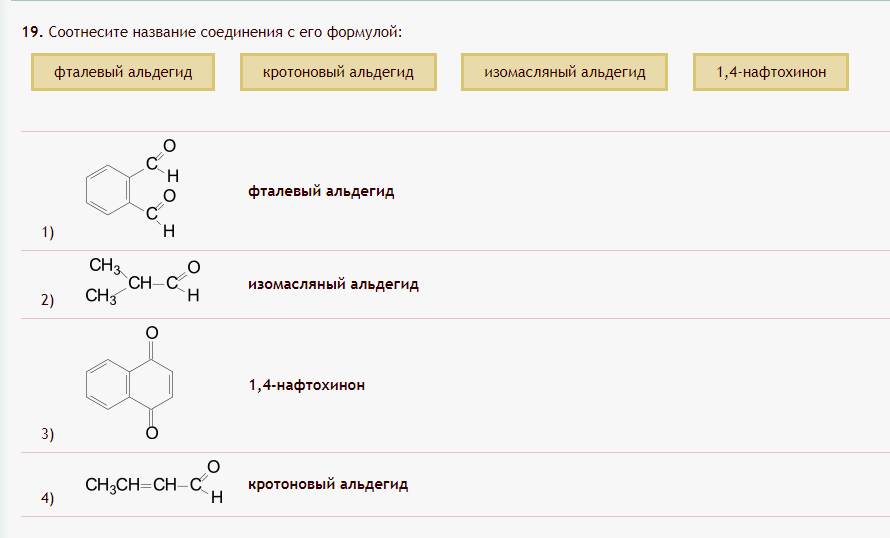 Соотнесите название соединения с его формулой: фталевый альдегид, кротоновый альдегид, изомасляный альдегид, 1,4-нафтохинон