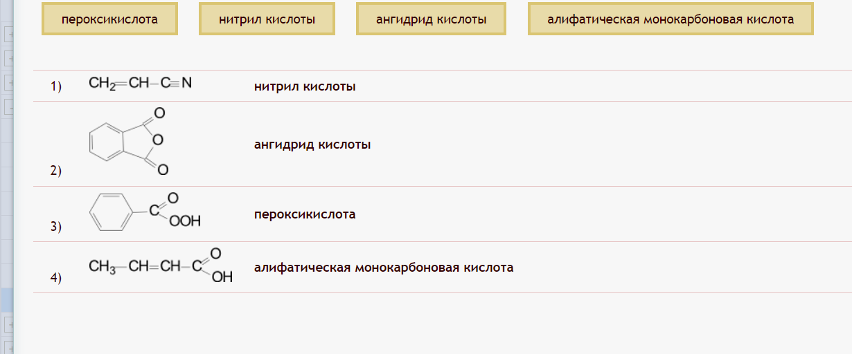 Соотнесите название класса соединений с формулой: пероксикислота, нитрил кислоты, ангидрид кислоты, алифатическая монокарбоновая кислота