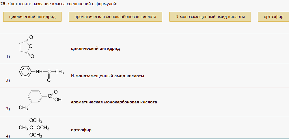 Соотнесите название класса соединений с формулой: циклический ангидрид, N-монозамещенный амид кислоты, ароматическая монокарбоновая кислота, ортоэфир