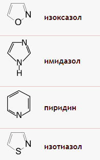 Соотнесите название вещества с его формулой: изоксазол, имидазол, пиридин, изотиазол