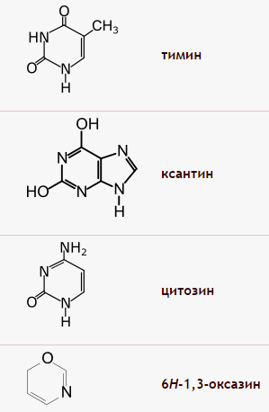 Соотнесите название вещества с его формулой: тимин, ксантин, цитозин, 6H-1,3-оксазин