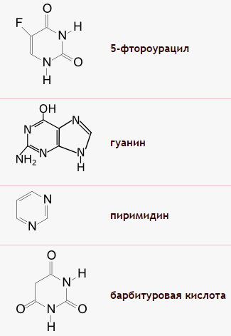 Соотнесите название вещества с его формулой: 5-фторурацил, гуанин, пиримидин, барбитуровая кислота