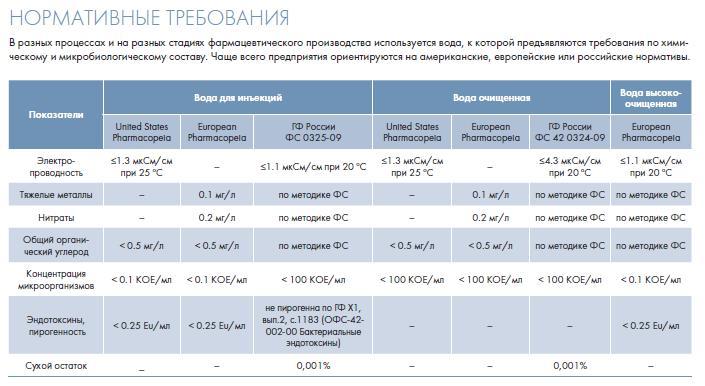 Требования к качеству воды регламентируется фармакопейными статьями (ФС.2.2.0020.15 «Вода очищенная» и ФС.2.2.0019.15 «Вода для инъекций»).