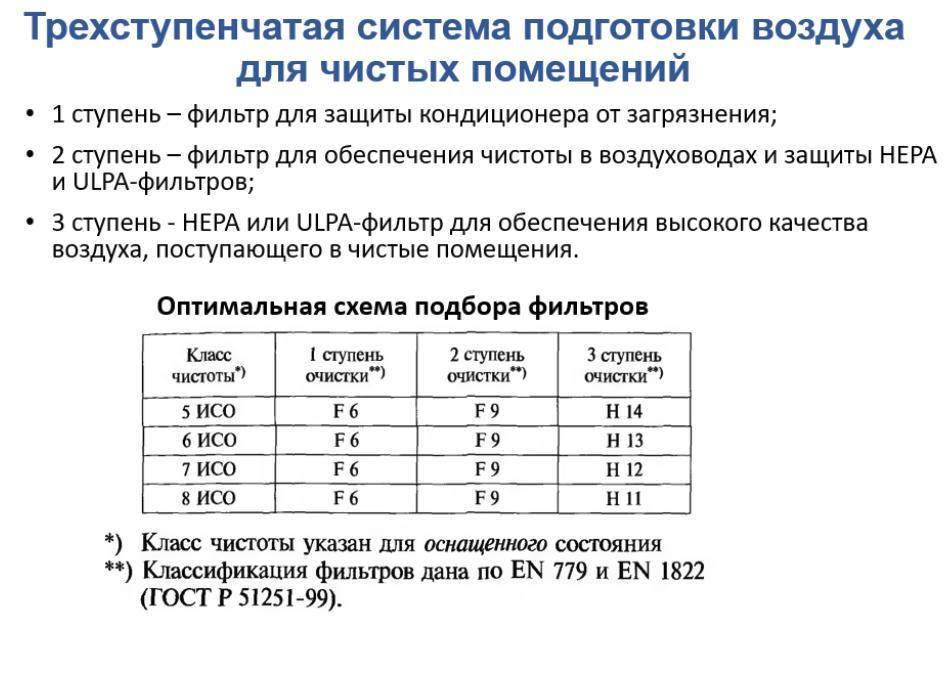 Для подготовки воздуха для чистых помещений различного класса и локальных чистых зон обычно используется трехступенчатая система воздушных фильтров (фильтровенти-ляционных модулей): 1 ступень – фильтр для защиты кондиционера от загрязнения; 2 сту-пень – фильтр для обеспечения чистоты в воздуховодах и защиты HEPA и ULPA-фильтров; 3 ступень – HEPA или ULPA-фильтр для обеспечения высокого качества воз-духа, поступающего в чистые помещения (рис. 17).