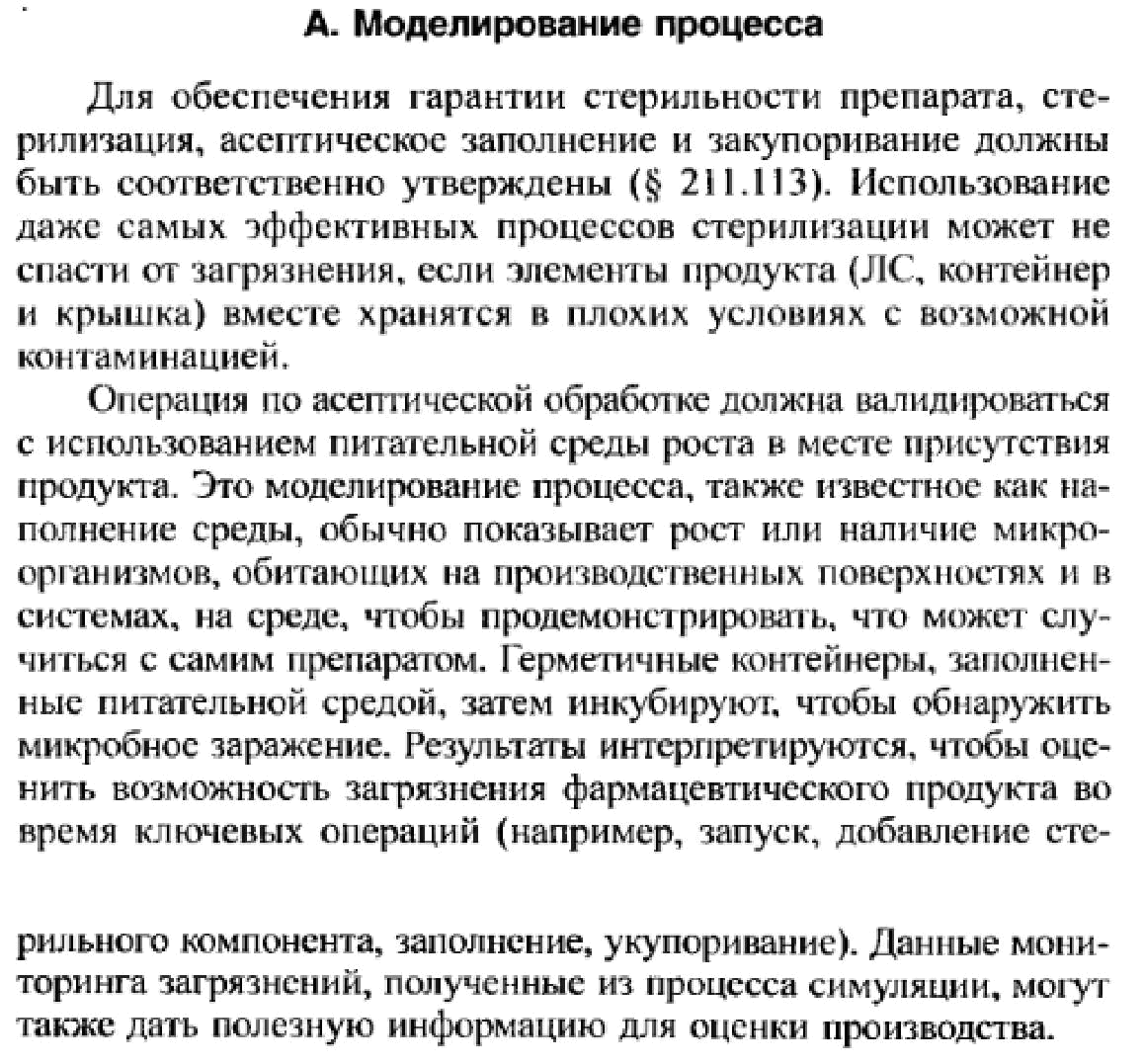 При производстве стерильных лекарственных средств с использованием асепти-ческих технологий до начала самого технологического процесса необходимо подтвердить, что на всем протяжении процесса изготовления препарата (т.е. длительность процесса), в продукт не попадает ни один микроорганизм. Вали-дация асептических условий проводится по сценарию имитации с помощью пи-тательных сред.