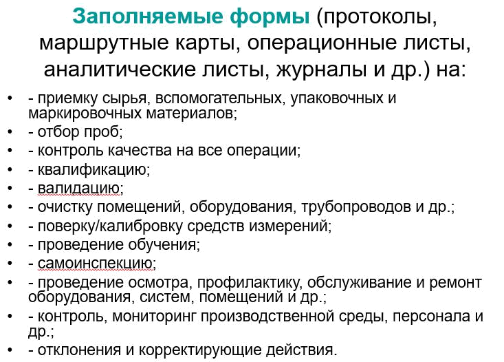 Существует два основных вида документации для выполнения требова-ний GMP и регистрации их соблюдения: инструкции (указания, требова-ния) и протоколы/отчеты.