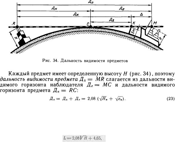 Географическая дальность видимости — дальность открытия ночью маячного огня, днем башни маяка или знака — зависит от кривизны земли, рефракции атмосферы и высоты огня, башни или знака над уровнем моря (рис. 21). Дальность открытия при высоте глаза наблюдателя, равной 5 м определяется по формуле