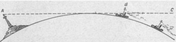 Рис. 21. Схема дальности видимости: АВ — географическая дальность видимости; АС— оптическая дальность видимости