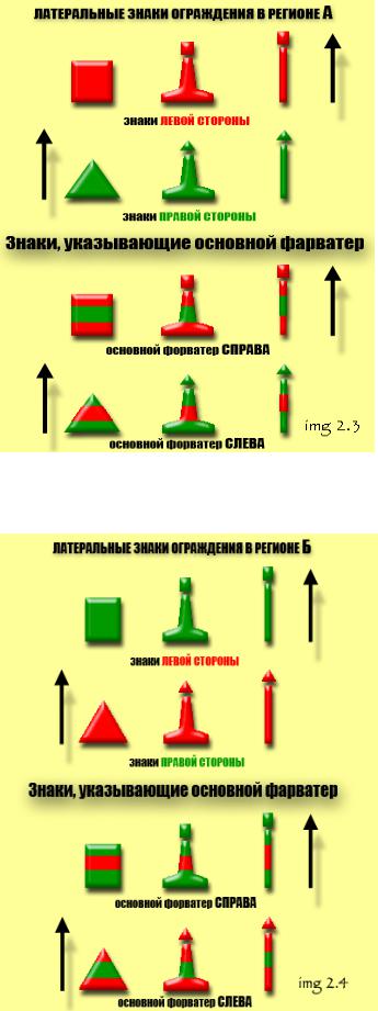 Врегионе А на латеральных знаках (рис. 2.3),выставляемых на левой и правой сторонах фарватера, зажигаются соответственно красные и зеленые огни.