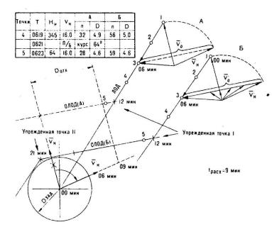 ЛОД в упреждённой точке окончания маневра, получая т.о. ОЛОД (ожидаемую линию относительного движения цели); из точки 3 (6 мин) векторного треугольника проводят новое направление вектора относительного движения (параллельно ОЛОД) и делают на нём засечку из начала нашего вектора его же длиной − получим курс (соединив начало нашего вектора с засечкой), на который необходимо лечь, чтобы разойтись с целью на заданной дистанции.
