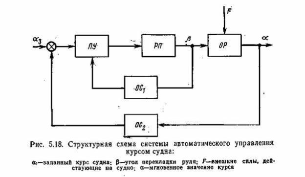 САУ курсом судна состоит из прибора управления (ПУ), который обычно называется авторулевым, рулевого привода (РП) с управляющим органом — рулем, судна как объекта регулирования (ОР), а также внутренней (OC1) и внешней (ОС3) обратных связей (рис. 5.18).