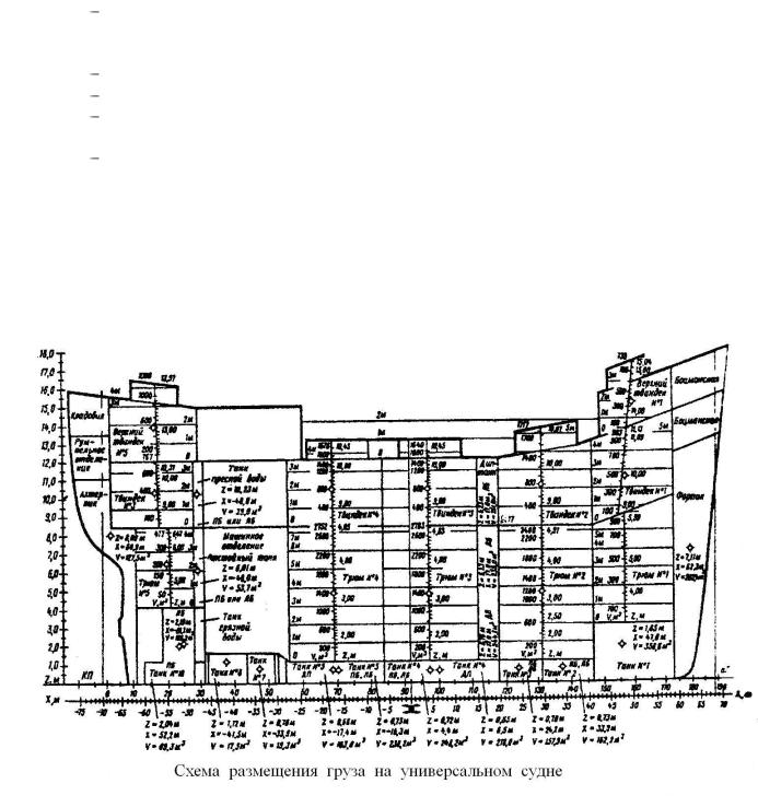 водонепроницаемыми отсеками и трюмами. Для танков указаны их объёмы и координаты ЦТ при полном заполнении. Для грузовых трюмов, которые могут быть заполнены не полностью и неоднородным грузом, координаты ЦТ определяют по построенным для каждого трюма шкалам заполненного объёма трюма и возвышения ЦТ в зависимости от уровня заполнения трюма.