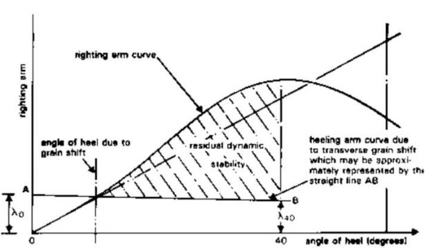 2– На статической диаграмме остойчивости, площадь остаточной остойчивости, ограниченная с одной стороны углом крена от смещения груза и с правой стороны углом заливания или 40 градусов, в зависимости от того, что меньше, должна быть не менее