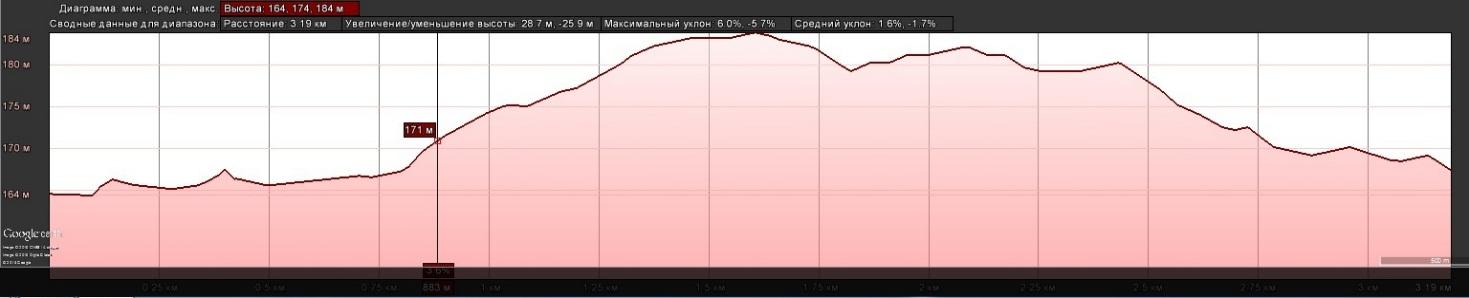 Диаграмма гипсометрического профиля, представленный в нижнем окне отображает следующие показатели:
