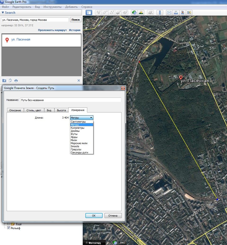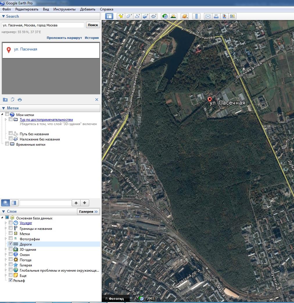 Рис. 7. Изображение с экрана программы Google Earth участка местности Лесной опытной дачи РГАУ-МСХА имени К.А. Тимирязева с ориентиром ул. Пасечная