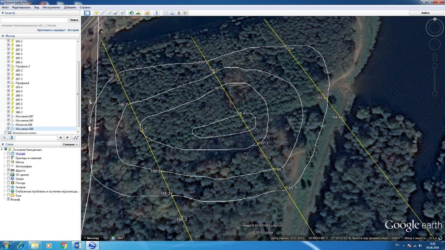 Используя метод построения гипсометрического профиля в программе Google Earth, рассмотренный в задании 1 построим несколько линий-профилей, которые размещаются на одинаковом расстоянии. Для удобства построения и работы с картографическим материалом точки могут отмечаться с перепадом в 0,25 м, 0,5 м,1 м и более метров.