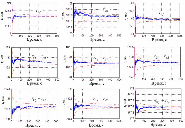 графикам видно, что все элементы вектора состояния наблюдаемы, а точность их оценивания находится на уровне 0,1 мм (1 ). По найденным оценкам легко вычисляются искомые расстояния ryX , ryY , ryZ , rzX , rzY , rzZ от полюса ИМ до ЧМ блока акселерометров.