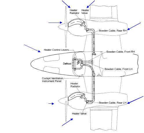 1 – рычаги управления обогревом; 2 – вентиляция кабины, главная приборная панель; 3 – радиатор обогрева; 4 – кран обогрева; 5 – трос в боуденовской оболочке, правый задний; 6 – воздухозаборник NASA; 7 – правый регулятор воздуха, поступающего в кабину; 8 – трос в боуденовской оболочке, правый передний; 9 – правый задний регулятор воздуха, поступающего в кабину (напольный); 10 – задние регуляторы воздуха, поступающего в кабину (потолочные); 11 – трос в боуденовской оболочке, левый передний; 12 – левый задний регулятор воздуха, поступающего в кабину (напольный); 13 – левый регулятор воздуха, поступающего в кабину; 14 – трос в боуденовской оболочке, левый задний