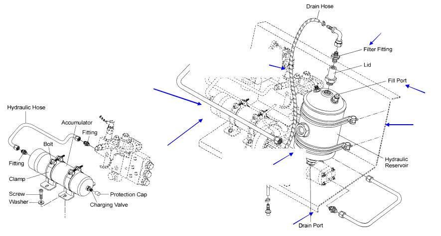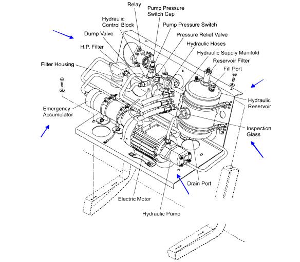 Элементы: гидравлический насос, бак, главный блок управления системой, гидравлический аккумулятор, фильтры и реле.