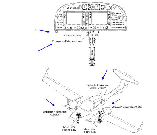 Уборка и выпуск. Гидравлическая система самолета DA 42 NG обеспечивает уборку и выпуск шасси. При уборке основные опоры шасси убираются в направлении фюзеляжа в нишу в центроплане, носовые опорывперед в нишу в носовой части фюзеляжа. Выпуск шасси обычно занимает 6–10 с. Шасси удерживаются в убранном положении давлением в гидросистеме. В случае отказа системы управления шасси предусмотрена возможность его аварийного выпуска под действием силы тяжести.