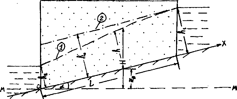 Рис. 3.6. Схема безнапорной фильтрации при наклонном водоупоре: 1 - депрессионная кривая; 2 - поверхность уровня расчетного равномерного потока
