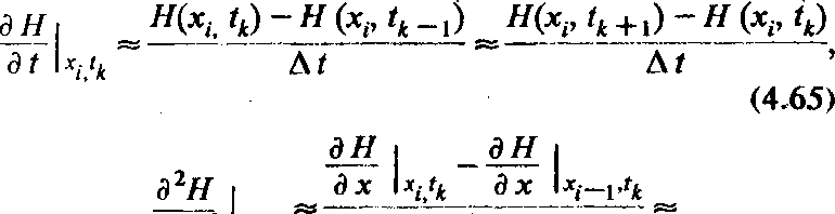 с которым и пространство, и время разбиваются на конечные интервалы, т.е. представляются дискретно на некоторой пространственно-временной сетке с узловыми точками xj} у;., tk. При этом реальное непрерывное распределение напоров Н(х, у, 0 заменяется дискретным: отыскивают или считают заданными напоры H(xif yt, tk) во всех узловых точках сетки. Производные от напора в той или иной точке при этом заменяют приближенными конечноразностными представлениями и они оказываются, таким образом, выраженными через разности в значениях напоров на концах пространственных или временных интервалов, включающих данную расчетную точку. Например, для одномерного плоскопараллельного случая, когда область фильтрации длиной L разбита сечениями xt (0 < х,-< L) на интервалы длиной Дх, а расчетный период времени t разделен на последовательные промежутки tA(0< tk< t) продолжительностью Д t, имеем следующие выражения для производных в произвольной точке сетки Ц, /1>: