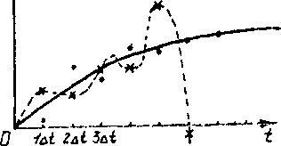Понятно, что и для человека, и для ЭВМ гораздо проще последовательно провести М однотипных расчетов по формуле (4.75а), чем решать систему из М уравнений. Поэтому, казалось бы, логически ясно, что всегда разумнее считать по явной схеме, нежели по неявной. Однако с конечно-разностными схемами дело обстоит отнюдь не так просто. Они обладают специфическими свойствами, из-за недоучета которых подобные, внешне логичные рассуждения могут оказаться неприемлемыми. Для примера на рис. 4.9 приведены в схематизированном виде результаты расчетов одной и той же фундаментальной (см. раздел 4.1.1) задачи по явной и неявной схемам. По мере роста времени (числа временных шагов) неявное решение все теснее сближается с точным (построенным по аналитической зависимости (4.12)). Между тем, явное решение при том же, достаточно большом, временном шаге At ведет себя весьма неестественно: оно начинает постепенно «раскачиваться» и приводит к физически не-