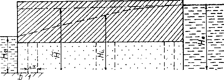 где пространственная производная в правой части выражена через значения напоров, отвечающие концу расчетного временного интервала (т.е. через напоры, отвечающие нижнему положению пьезометрической кривой на рис. 4.7а).