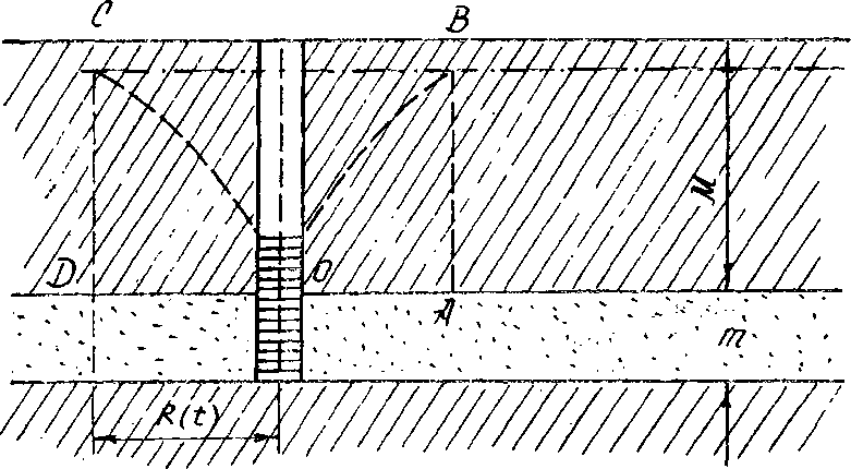 [Т| Особенности упругого режима при откачках из глубоких водоносных горизонтов обусловлены сопоставимостью размеров области возмущения при откачке (условно оконтуриваемой некоторым радиусом влияния Л (t) —рис. 5.11—с мощностью перекрывающих пород М. Чтобы понять значение этого фактора, уподобим объем пород ABCD круглой жесткой плите, подпираемой снизу реакцией минерального скелета и гидростатическим давлением воды в напорном пласте, но также закрепленной по своей боковой поверхности механическими связями с окружающими породами. Наличие жесткости и закрепления начнет проявляться при деформировании плиты — в виде реакции, препятствующей ее прогибу.