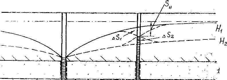 для простоты считать водоупором. При откачке из такого пласта, ввиду большей скорости распространения возмущения по нижнему слою, понижение в нем будет идти заметно быстрее, чем в верхнем. Между слоями возникает, таким образом, перепад напоров, и движение в пласте, рассматриваемом как единый водоносный горизонт, не отвачает основной предпосылке плановой фильтрации. То же произойдет и при отсутствии водоупорного прослоя, с одной лишь разницей — перепад напоров между слоями будет постепенно сглаживаться за счет перетока воды из нижнего слоя в верхний.