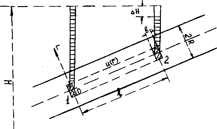 где точка 1 расположена по течению выше, чем точка 2. Напорная поверхность понижается по направлению движения (линия на рис. 4) тем сильнее, чем больше силы трения.