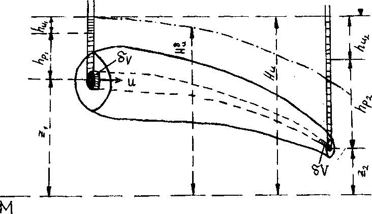 Сумма Hu=hp+z+hu называется гидродинамическим напором и отражает, таким образом, полную энергию единицы веса движущейся жидкости. Уравнение (1.11), связанное с именем Бернулли, говорит о том, что для стационарного движения идеальной жидкости гидродинамический напор в различных точках трубки тока является