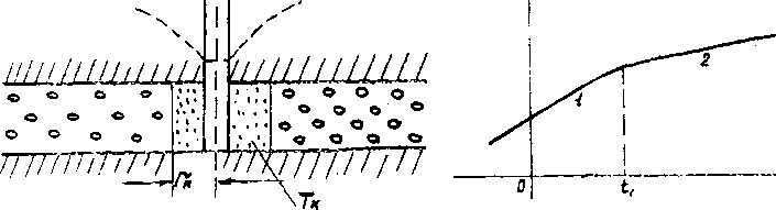 т.е. при малых значениях Тк перепад напоров, вызванный наличием закольматированной зоны, может составлять большой процент от оощего перепада напоров, или, иначе говоря, фильтрационное сопротивление этой зоны может быть соизмеримо с сопротивлением всей остальной части пласта в пределах зоны влияния.