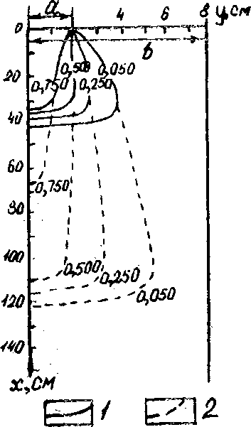 Значение поперечной дисперсии проще всего проиллюстрировать, запуская меченые частицы жидкости не по всей ширине, а лишь на ограниченном участке фильтрационного потока. Поперечная дисперсия приводит к распространению меченых частиц за пределами зоны, ограниченной крайними траекториями фильтрации меченой жидкости, к появлению здесь переходных зон и *: уменьшению скоростей продвижения фронта вытеснения в продольном направлении. Все это хорошо иллюстрируется рис. 6.8 [21], полученным по конкретному эксперименту.