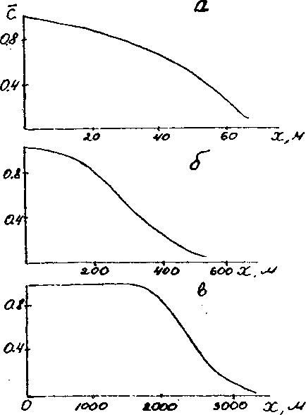 Можно показать [34], что для описания процесса переноса в основном пласте справедливо выражение, аналогичное решению (6.27), полученному в рамках схемы микродисперсии (см. раздел 6.3). Однако диалог параметра D— коэффициент макродисперсии D — пропорционален здесь квадрату скорости фильтрации, личиваются и размеры переходной зоны. Следовательно, при макродисперсии роль эффектов рассеивания вещества проявляется гораздо сильнее, чем в условиях расчетной схемы микродисперсии, так что ими часто нельзя пренебрегать даже в пористых породах.