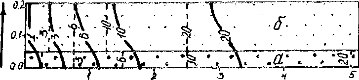а и б - более и менее проницаемые слои соответственно: сплошные изолинии 7—0,5 — с с учетом полперечной дисперсии; пунктирные - при отсутствии взаимодействия между слоями. Числа на изолиниях - расчетные моменты времени, сут.