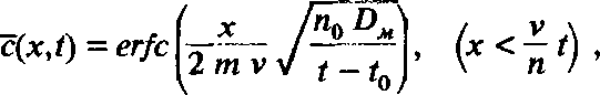 Первое условие исходит из требования достаточно полного насыщения слабопроницаемого слоя — для точек, удовлетворяющих второму условию. Последнее, в свою очередь, означает, что рассмотренное решение достаточно хорошо описывает распределение концентрации лишь на задней части фронта (с > 0,5), так как в его передней части параллельный перенос никогда не достигается: значительный объем слабопроницаемого слоя всегда остается здесь недонасыщенным по отношению к концентрации в основном слое.