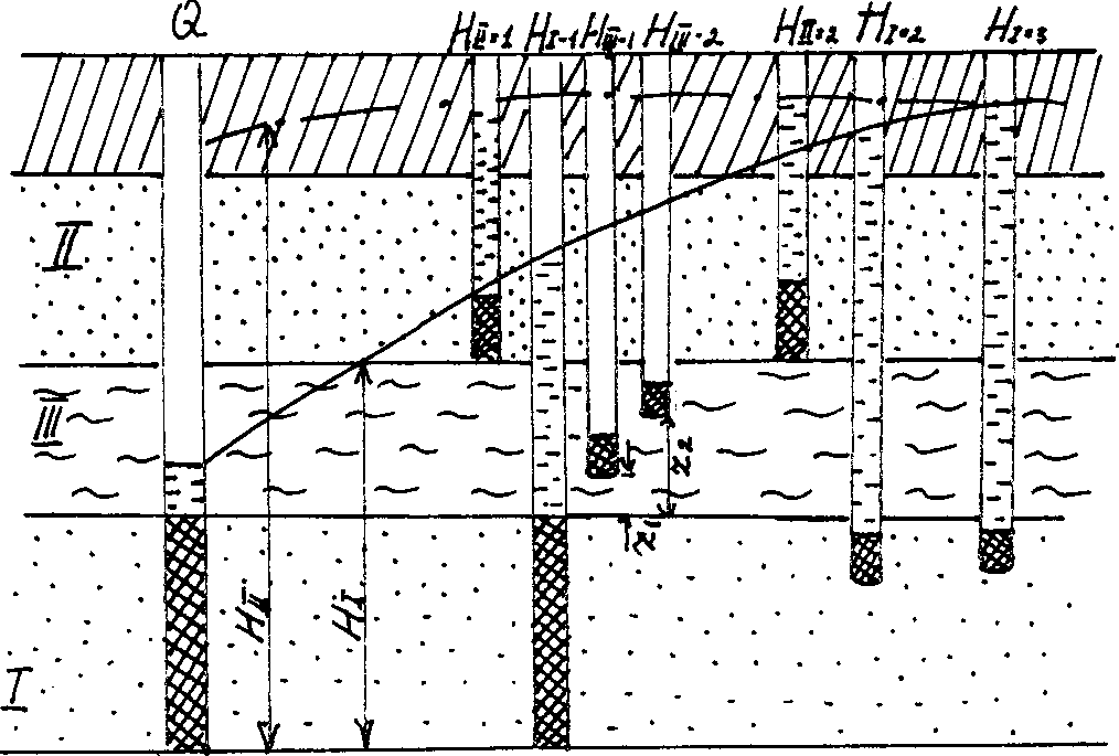 I - основного; II - взаимодействующего; III - разделяющего; Q - центральная скважина; Н.. - Я» ? - О наблюдательные скважины на основной пласт; Hjj_j ~ Нц~2 пьезометры на взаимодейстующий пласт;