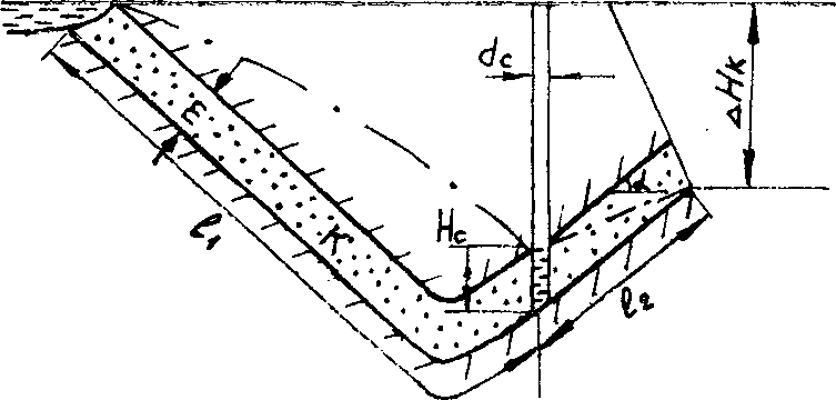 Своеобразные условия дренажа возникают на тех участках фильтрующих откосов, где падение слоев направлено в сторону массива (рис. 8.8). В этом случае появляется возможность полного устранения высачивания на откосе при работе дренажных скважин. В частности, пользуясь методом фильтрационных сопротивлений, нетрудно показать, что для случая Нсж 0 такая возможность реализуется при выполнении требования: