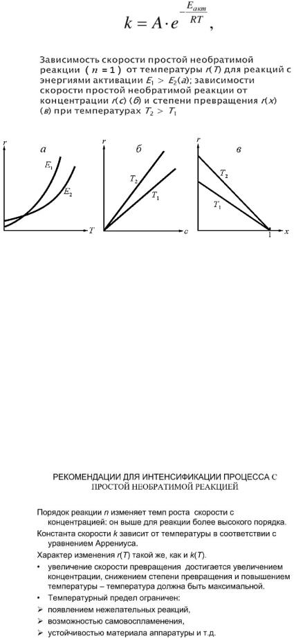Повышение температуры обуславливает интенсификацию процесса (увеличение скорости) для необратимой реакции. При необходимости достижения максимальной интенсивности температуру следует увеличить до максимума, допустимого для данной реакционной системы (при любых концентрациях и, соответственно, степенях превращения). Ограничение температуры вызвано термостойкостью компонентов, появлением нежелательных реакций, возможностью самовоспламенения, устойчивостью материала аппаратуры и т.д.