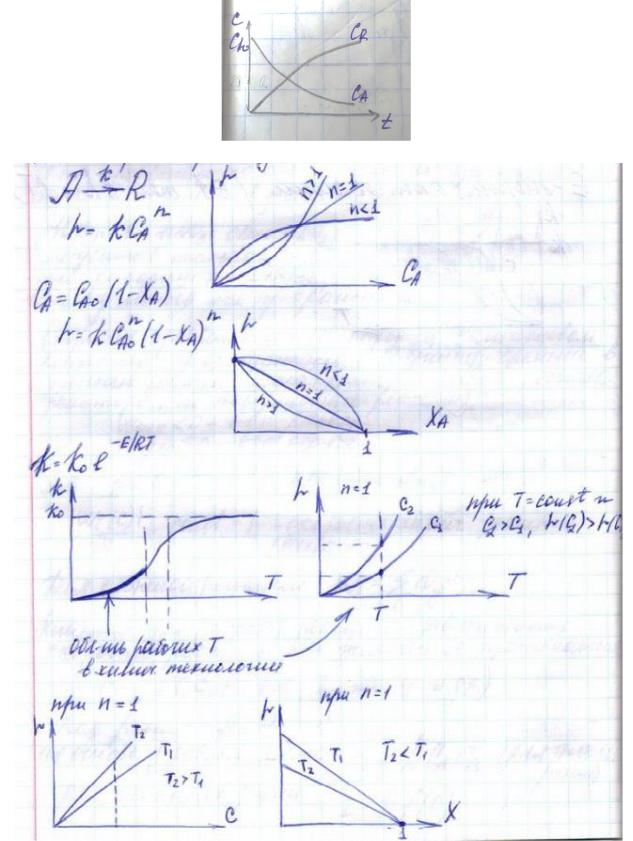 - Температура влияет на наклон зависимостей r(c) и r(x). При более высокой Т превращение происходит быстрее, т.к. с Т константа скорости тоже возрастает (которая прямо пропорциональна скорости)