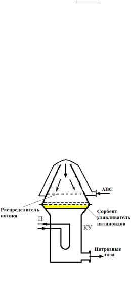 Аммиачно-воздушная смесь (АВС) при поступлении в реактор, проходя и контактируя с нагретой конусной частью реактора, нагревается за счет теплового излучения, исходящего от слоя катализатора. Окисление аммиака осуществляется на платиноидном катализаторе, выполненном в виде нескольких сеток, после чего реакционные газы охлаждаются в котле-утилизаторе. Для равномерного распределения потока по сечению тонкого слоя катализатора реактор должен иметь распределительную решетку в конусной части реактора.