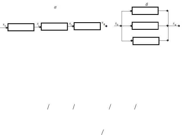 оптимизации режима процесса, или увеличения общей степени превращения. Рассмотрим параллельное и последовательное соединение реакторов и сопоставим их по интенсивности (общему объему, необходимому для достижения одинаковой степени превращения хк или конечной концентрации Ск) и селективности процесса в них (при протекании сложной реакции).