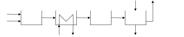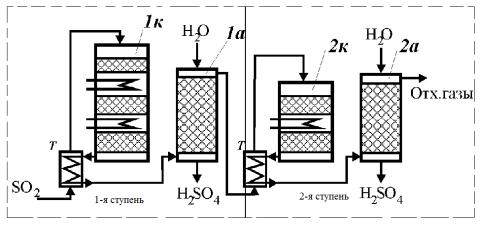 На первой ступени окисления использован трехслойный реактор 1к,. Концентрация SO2 в поступающем газе - 9,5-10,5%. Степень превращения на выходе из реактора 90-95%. Промежуточная абсорбция SO3 идет в включает абсорбер 1а,. После него газ содержит только 0,6-1%. Поскольку во второй ступени тепла выделяется мало (из-за низкой концентрации SO2), для нагрева газа до температуры реакции используют теплообменник после второго слоя реактора 2к. Степень превращения оставшегося SO2 составляет примерно 95%, общая степень превращения - 99,6-99,8%. В этой схеме реакционную смесь приходится нагревать дважды сначала до температуры реакции перед головным слоем первого реактора, и после его охлаждения, что необходимо для промежуточной абсорбции SO3 перед вторым реактором. Нагрев осуществляется за счет тепла реакции (прием, который называется регенерация тепла).